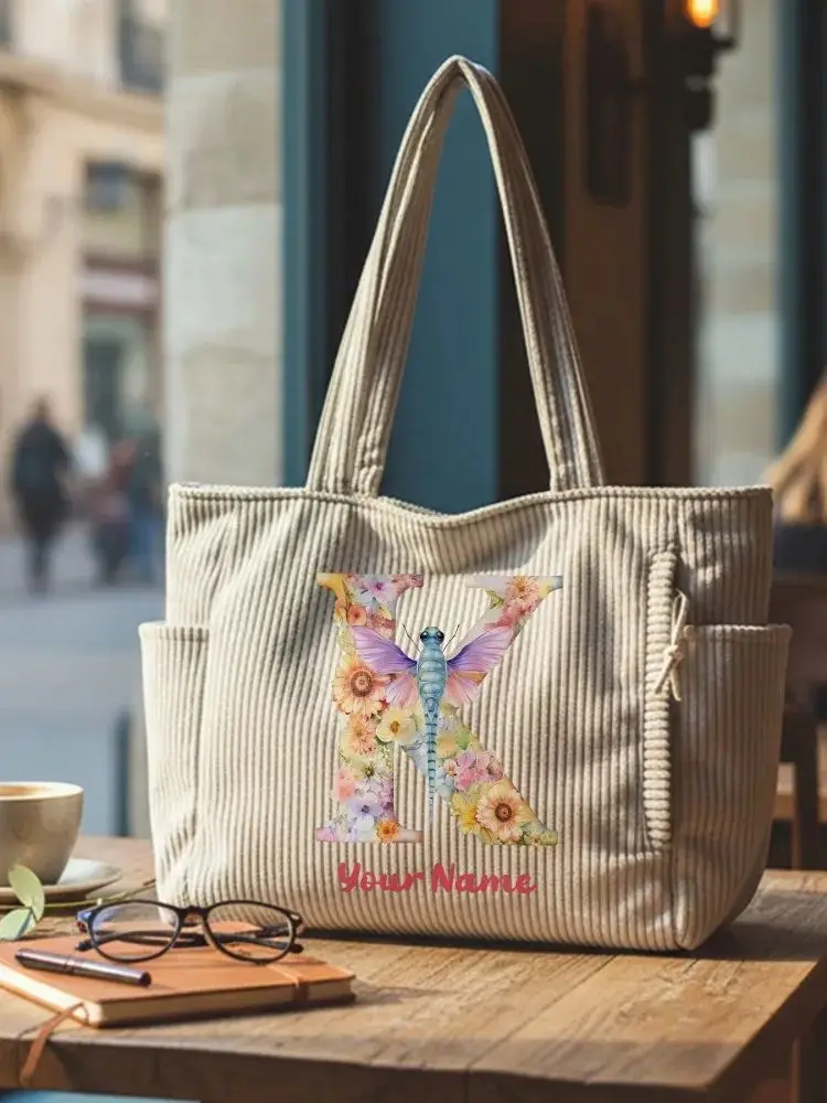 Custom Name Corduroy Tote Bag Beach Shoulder Travel,Floral Dragonfly Initial Bag, Summer Birthday Mother's Day Vacation Everyday