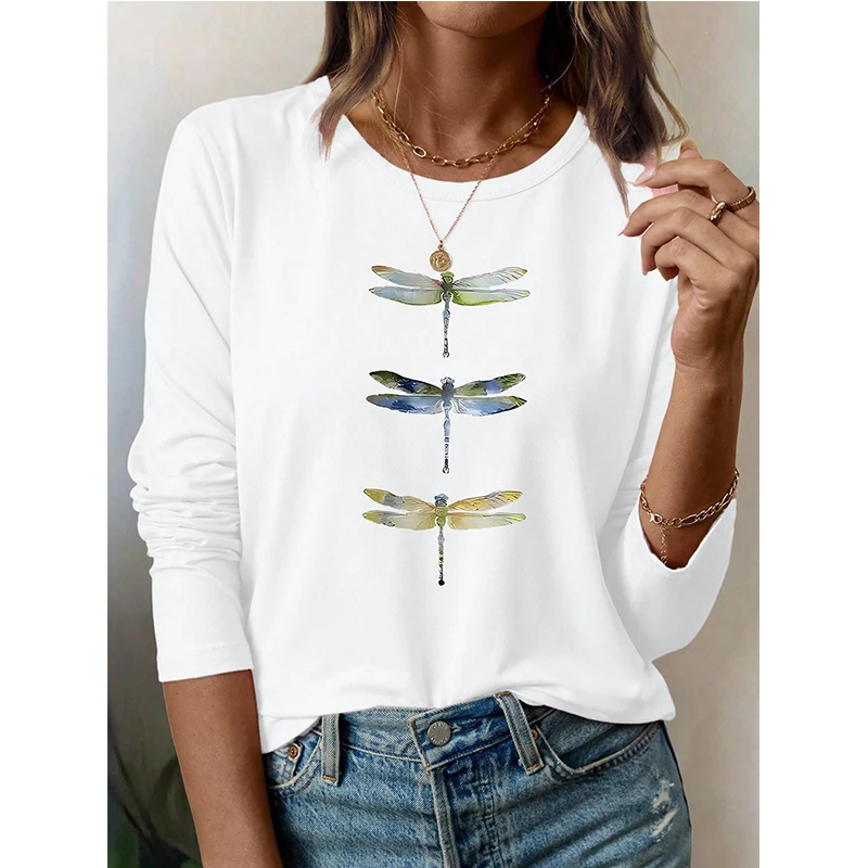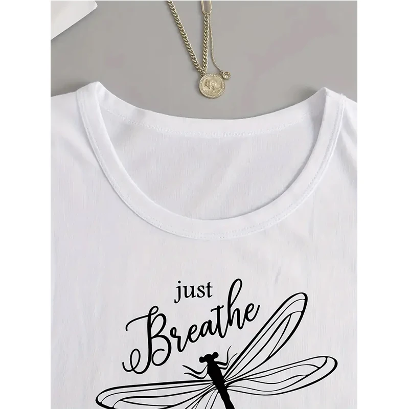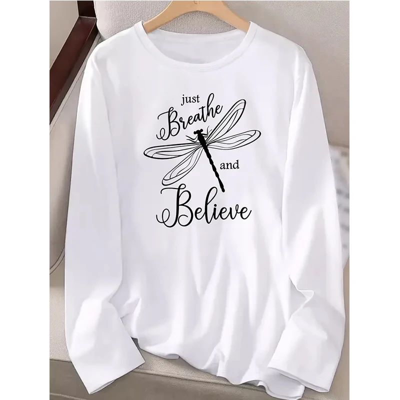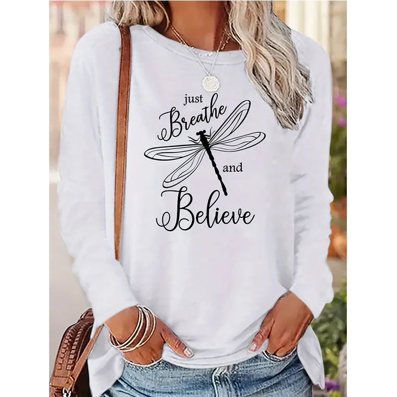 Women's Casual Dragonfly Crew Neck Long Sleeve T Shirt "Just Breathe Believe" Design Graphic White T-shirt Gothic Y2k Tees Tops